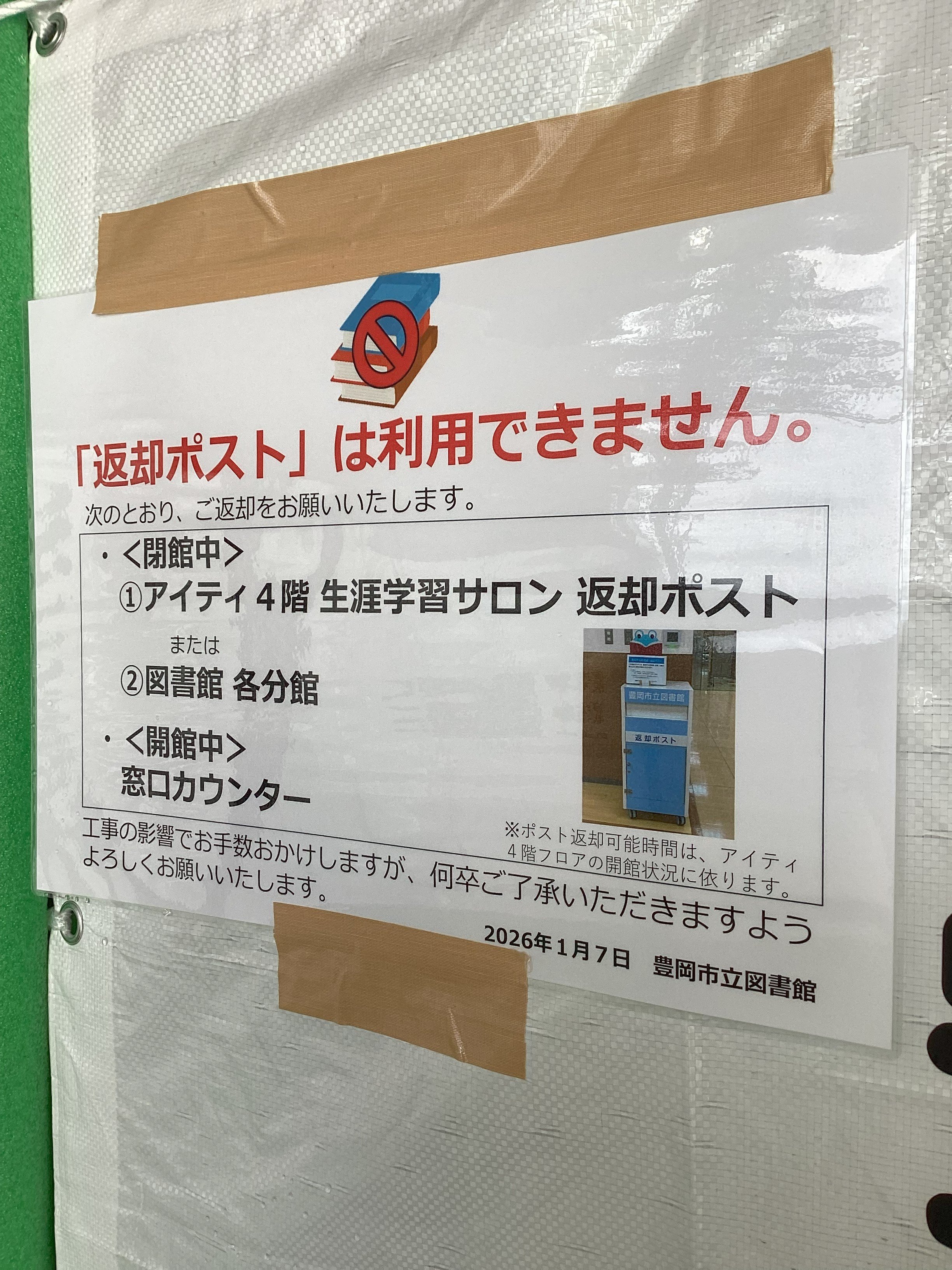 ホーム > 図書館からのお知らせ > 【本館】ブックポストの利用停止について 【本館】ブックポストの利用停止について 現在本館のブックポストが利用できません。休館日や閉館後の返却は、Aity4階の返却ポストまたは分館ブックポストをご利用ください。ご迷惑をおかけしますが、ご注意ください。